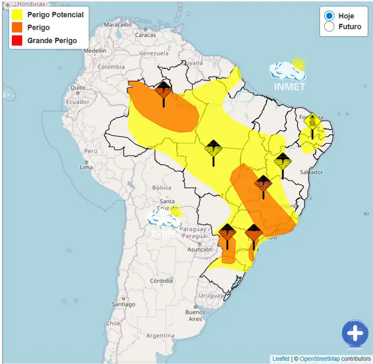 Além do Estado do Rio, o alerta vale para uma faixa que começa na ponta leste de Mato Grosso e se estende por Goiás na direção de Minas Gerais e São Paulo até atingir o litoral norte paulista e quase toda faixa litorânea fluminense (exceção na ponta norte).
